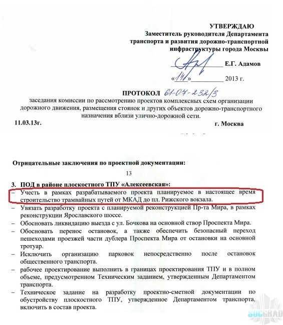 1) Центр Организации Дорожного Движения (ЦОДД, подразделение Департамента Транспорта) при рассмотрении проекта организации движения в районе метро Алексеевская в связи со строительством ТПУ прямо указывает на то, что существует проект восстановления трамвайной линии
