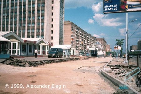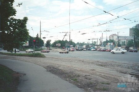 То же место летом 1999 года. Над выходом из подземного перехода построен симпатичный торговый павильон, но трамвайных путей уже нет. Самое интересное — проезжая часть проспекта в расширении не нуждалась и осталась прежней (по 5 полос в каждую сторону). Зачем надо было разбирать рельсы — совершенно непонятно.