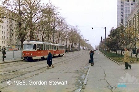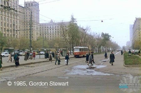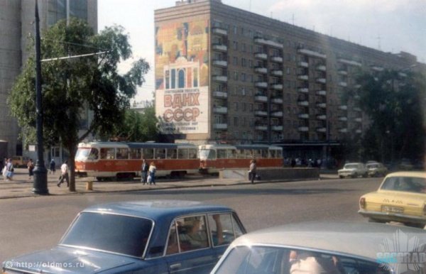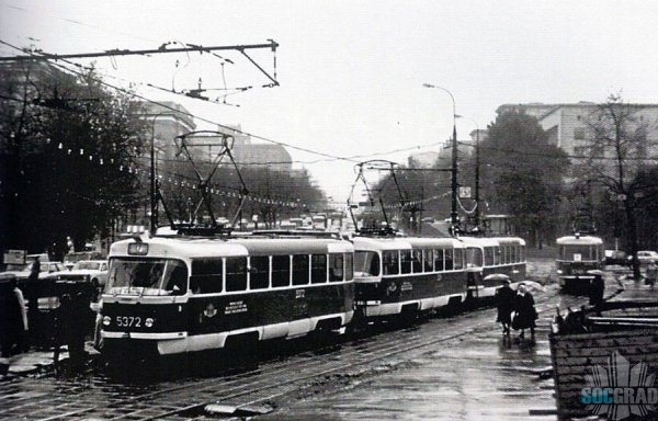 Трамвайные пути вдоль проспекта Мира у метро «Щербаковская» (ныне «Алексеевская») в 1991 году. Вдали виден трамвай маршрута 5 — он был одним из самых загруженных в Москве.
