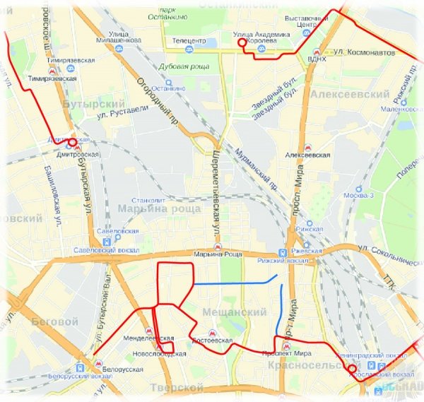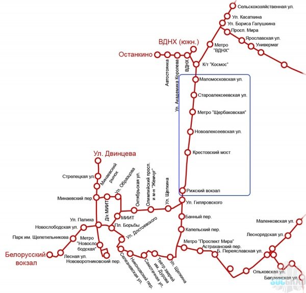 Ну и в заключение скажу о возможных маршрутах по новой линии. Помимо упомянутого нового маршрута «Рижский вокзал» — «Ярославская»(ул.Ротерта) (дадим ему условный номер №55), можно будет восстановить один из важнейших утраченных маршрутов №5 «Медведково» — «Белорусский вокзал». Во время существования этого маршрута он был настолько популярен, что на него выпускались даже трехвагонные поезда.