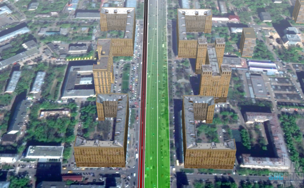Второе место — Новоалексеевский тоннель, портал которого выходит на место, где раньше шли трамваи. Но тут между порталом и зданиями остается достаточно места для прохождения линии.