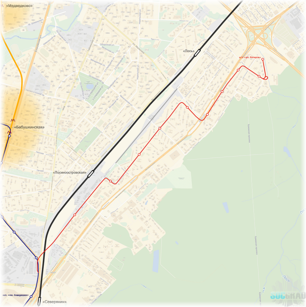 Далее линия под эстакадой пересекает Ярославское шоссе в месте пересечения с Малыгинским проездом, а после сворачивает на ул. Ротерта, где на границе района можно разместить разворотное кольцо «ул.Ротерта» (к/с «Ярославская»).