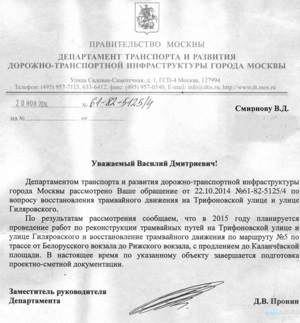 Дептранс обещает восстановить трамвай №5 по Трифоновской и Гиляровского в 2015 г. А там глядишь и на проспекте Мира…