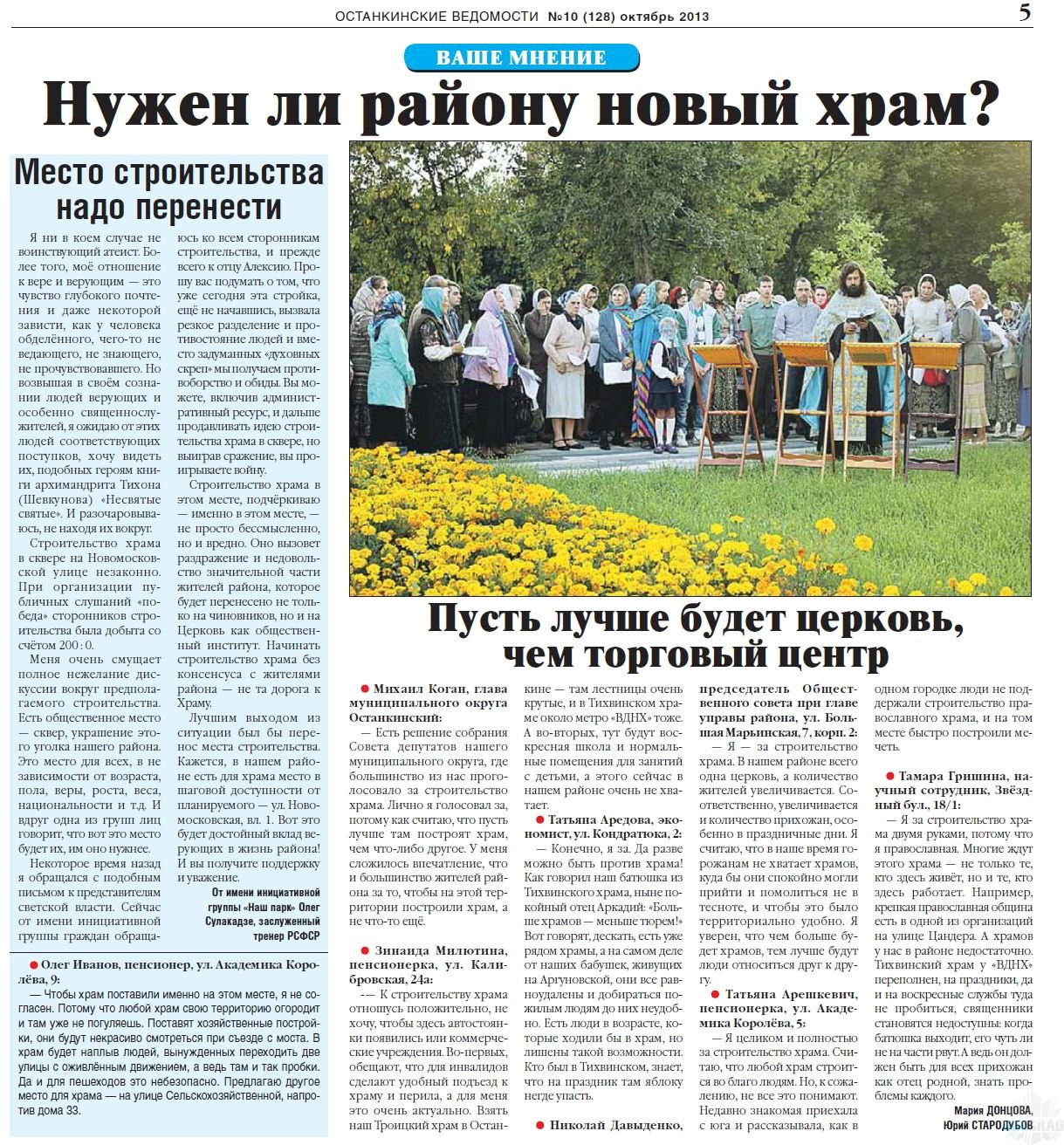 1. абсолютно все противники храма на Новомосковской улице в Останкино не живут.