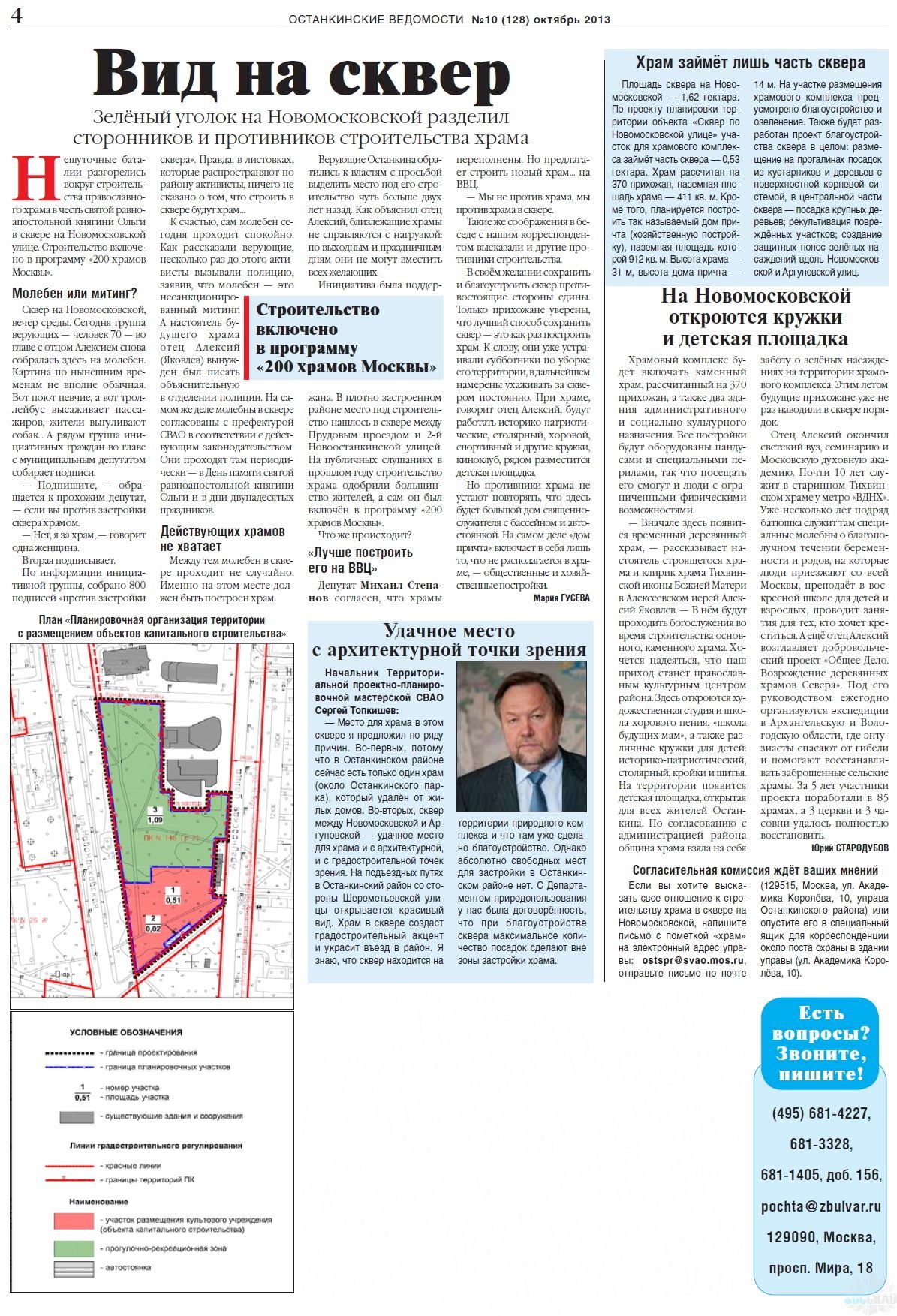 Я бы очень хотел, что бы прочитали моё письмо и, совсем хорошо, если бы Вы это сделали не в кабинете под присмотром портрета мэра или президента, а дома после работы, когда Вы превращаетесь из высокопоставленного городского чиновника в простого, уставшего после работы гражданина. Может быть, Вам тогда будет легче проследить ход моих мыслей и развеять мои сомнения. А то, вроде, математическую школу закончил, два высших образования, жизненный опыт, много толстых книг прочитал, а никак не пойму почему в точке А, отстоящей на 500метров от церкви Нечаянной радости в Марьиной роще, — в 1000метров от церкви Животворящей Троицы в Останкино, и на 1500 метров от церкви на Алексеевской горке надо перекопать сквер и построить ещё одну церковь. Вы не можете не знать, про невероятную плотность застройки СВАО и района Останкино в частности, не можете не знать статистику постоянного роста экологически связанных заболеваний. И в этих условиях упорно продвигать проекты уплотнения и застройки скверов, это, на мой взгляд, просто вызов здравому смыслу и полное безразличие к мнению жителей, в угоду группе лиц, заинтересованных в захвате куска такой дорогой, и потому особенно желанной, московской земли