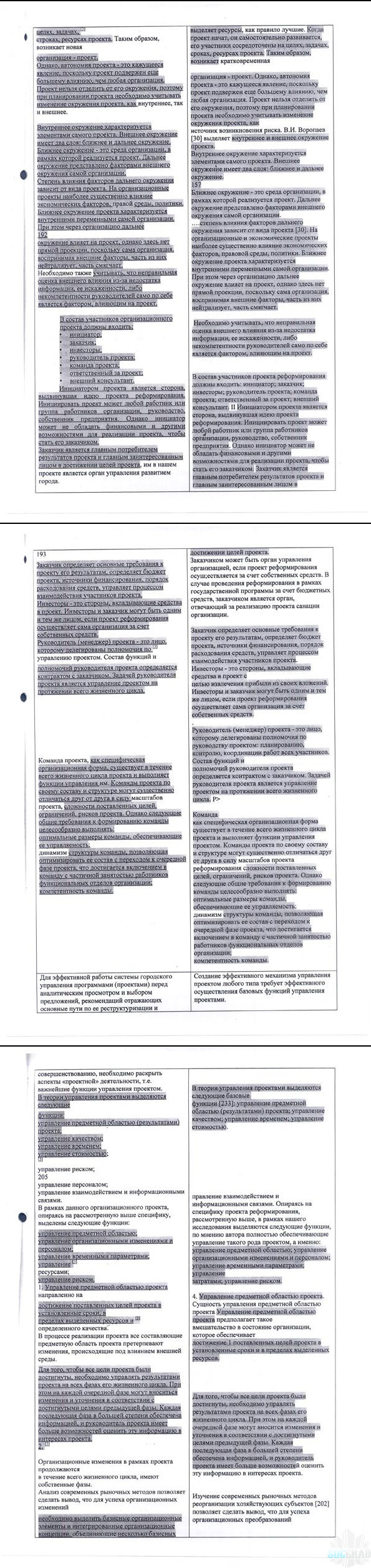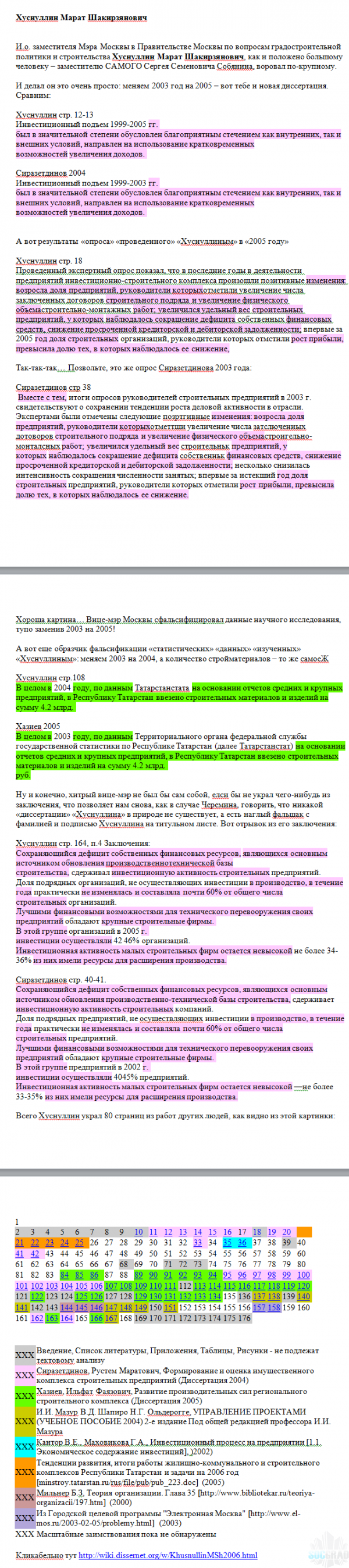Так что пока наука не дала однозначного ответа на эти проклятые вопросы современности, в диссертации Марата Хуснуллина чужие тексты использованы без кавычек и сносок. В исследовании Андрея Заякина представлены страницы этой диссертации, каждая — в сопоставлении с дословно соответствующей страницей из более ранних работ других авторов. Всего «позаимствованных» обнаружилось 80 страниц из 176. Охотник на плагиат делает вывод: «Никакой „диссертации Хуснуллина“ в природе не существует, а есть наглый фальшак с фамилией Хуснуллина на титульном листе».