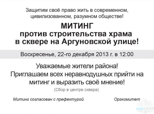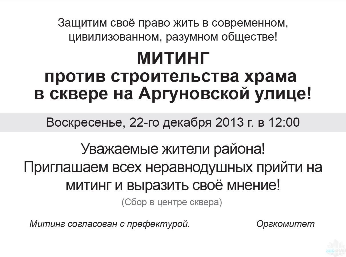 22 декабря в Останкинском районе города Москвы состоится митинг против строительства храма со всеми возможными пристройками в сквере между Аргуновской и Новомосковской улицами.