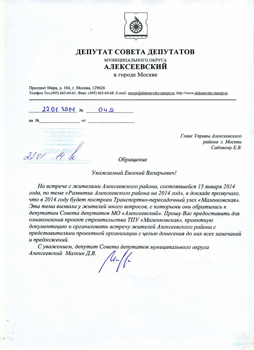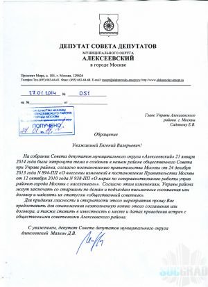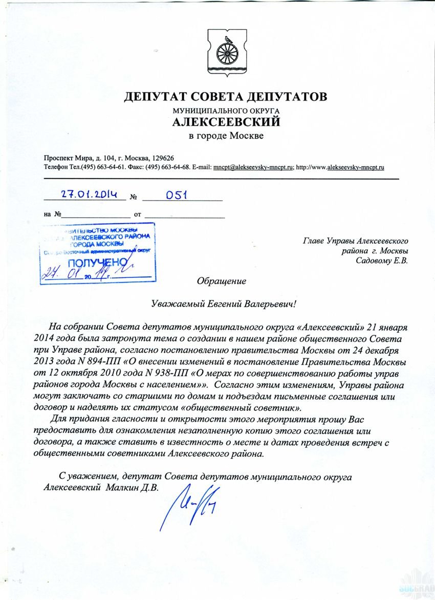На собрании Совета депутатов муниципального округа «Алексеевский» 21 января 2014 года, мной была внесено предложение заслушать Главу Управы о создании Общественных советах при Управах районов согласно постановлению правительства Москвы от 24 декабря 2013 года N 894-ПП «О внесении изменений в постановление Правительства Москвы от 12 октября 2010 года N 938-ПП «О мерах по совершенствованию работы управ районов города Москвы с населением»».
