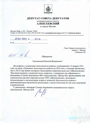 И еще, во время ознакомления с «программой развития округа на 2014 год», я попросил организовать встречу жителей Алексеевского района с представителями проектной организации, по вопросу строительства ТПУ «Маленковская», с целью донесения до них всех замечаний и предложений с предоставлением документов для ознакомления по проекту этого строительства.