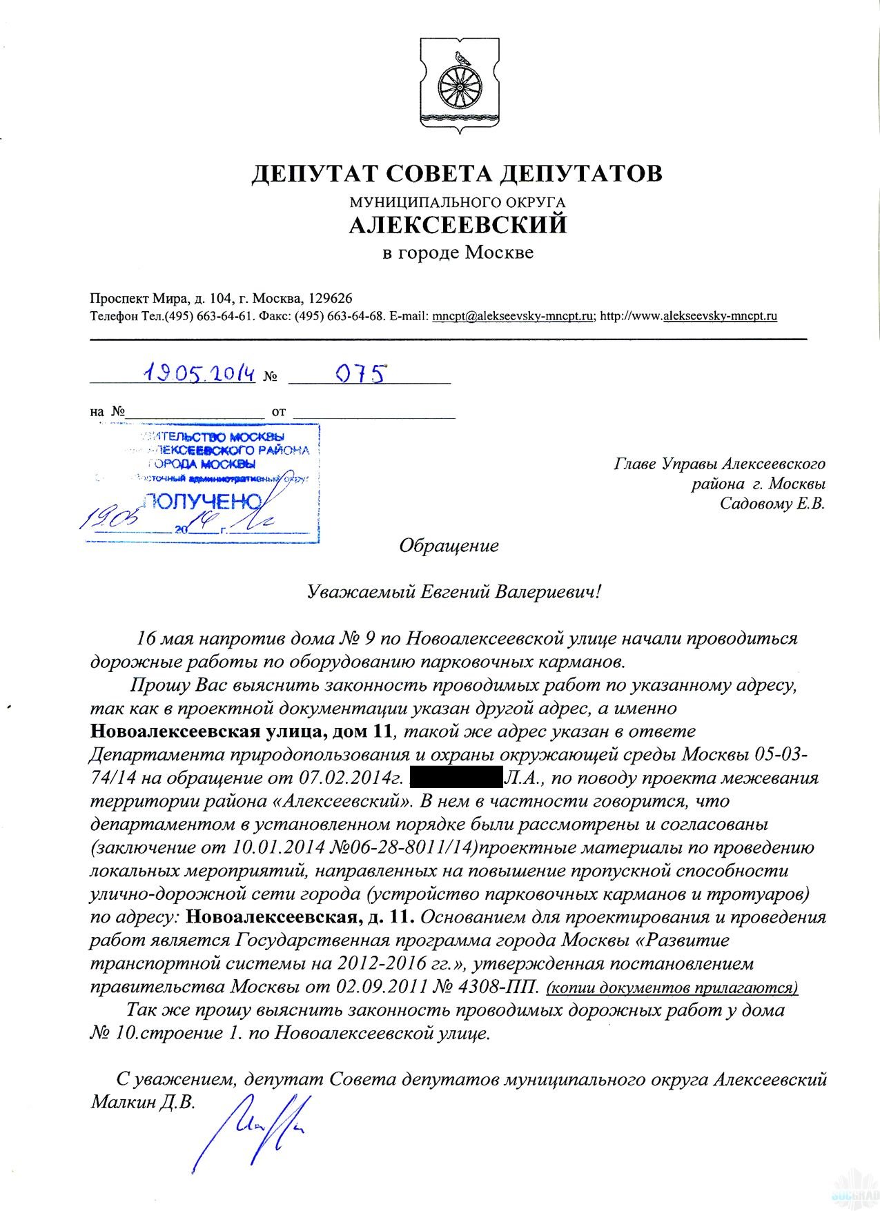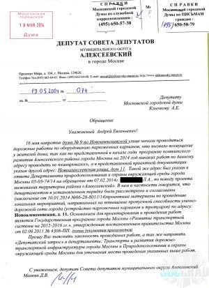 У нас в районе набирает обороты государственная программа г. Москвы «Развитие транспортной системы на 2012-2016 гг.». Сперва эта программа непосредственно коснулась жителей микрорайона у метро ВДНХ, где им прямо под окнами разместили открытый автовокзал, по научному — Транспортно-пересадочный узел или ТПУ. В народе это ТПУ сразу же получило название «Газовая камера на ВДНХ». Больше всех от этого проекта пострадали жители многоквартирных домов по ул. проспект Мира, д.146 и ул. Космонавтов, д. 4.Открытие этого ТПУ усугубило и без того напряженную экологическую, санитарно-эпидемиологическую, транспортно-пешеходную и криминогенную ситуации в районе. Хоть жителями и было написано более 2000 писем в органы исполнительной и законодательной власти, проведено два протестных пикета, были задействованы все рычаги, которые могли бы как-то повлиять на эту ситуацию, в том числе и СМИ, но как говорится: «Воз и ныне там». Но оказалась, что это было только начало, ТПУ появилось у метро «Алексеевская» и ожидается на подходе у платформы «Маленковская». Теперь появилась новая напасть, а именно устройство парковочных карманов, опять же вопреки желанию жителей и без их согласия. Вчера такие работы стали проводиться на двух улицах нашего района: на Новоалексеевской у дома №9 и Рижском проезде, д. 7. Жители этих домов на себе смогли ощутить все прелести этой программы, когда прибывшая к их домам строительная техника стала уничтожать газоны, отгораживающие пешеходные дорожки от проезжей части. Люди попытались вмешаться и остановить этот беспредел, узнать, на каком основании ведутся работы, и кто за этим стоит, задействованы были даже представители правоохранительных органов – полицейский участок находится прямо на противоположной стороне от дома. В итоге после беседы с полицией работы не только не остановились, а еще и начались на противоположной стороне улицы, прямо напротив участка, хотя проектом эти работы, как потом выяснилось, не предусмотрены. Для решения этой напасти люди звонили по всем горячим линиям города, восемь раз обращались за помощью к Мэру, посылая ему сообщения на пейджер. В итоге после всех консультаций и переговоров выяснилось, что все работы ведутся по Постановлению Правительства Москвы от 2 сентября 2011 г. N 408-ПП «О государственной программе города Москвы „Развитие транспортной системы на 2012-2016 гг.“, в котором в частности говорится, что цель этой программы: Обеспечение комфортных условий жизнедеятельности населения города Москвы путем развития устойчиво функционирующей, экономически эффективной, привлекательной и доступной для всех слоев населения системы городского пассажирского транспорта города Москвы…;