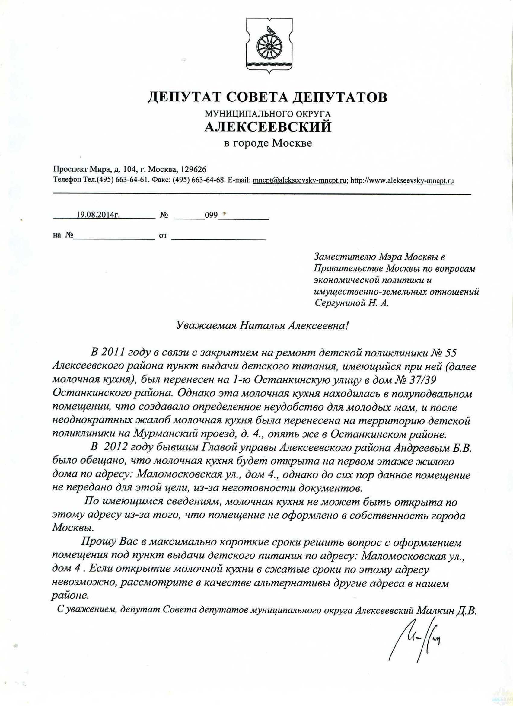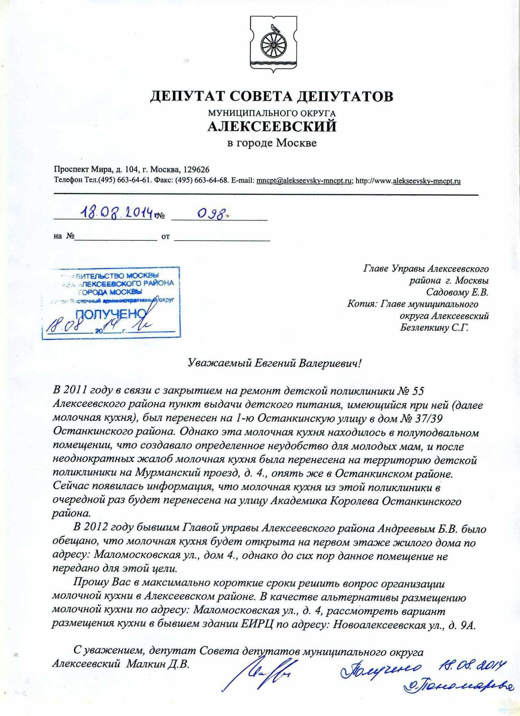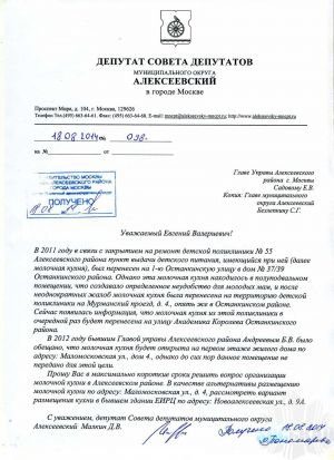 После неоднократных жалоб и обращений молочная кухня благополучно была перенесена на территорию детской поликлиники на Мурманский проезд, д. 4., опять же в Останкинском районе. Хотя еще в 2012 году бывшим Главой управы Алексеевского района Андреевым Б.В. было обещано, что молочная кухня будет открыта на первом этаже жилого дома по адресу: Маломосковская ул., дом 4., как раз в высотке, построенной на месте родильного дома. Но, как говорится, прошли года, Глава управы ушел на повышение, а молочная кухня теперь готовится к переезду на новый адрес, но опять же в Останкинский район.