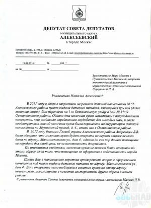 Создается впечатление, что в Алексеевском районе делается все, чтобы не было естественного прироста населения, а прирост был только за счет новостроек. Взять хотя бы закрытие единственного в районе родильного дома и строительство на его месте высоток. Да и история с молочной кухней о многом говорит.