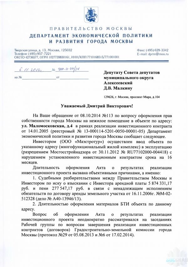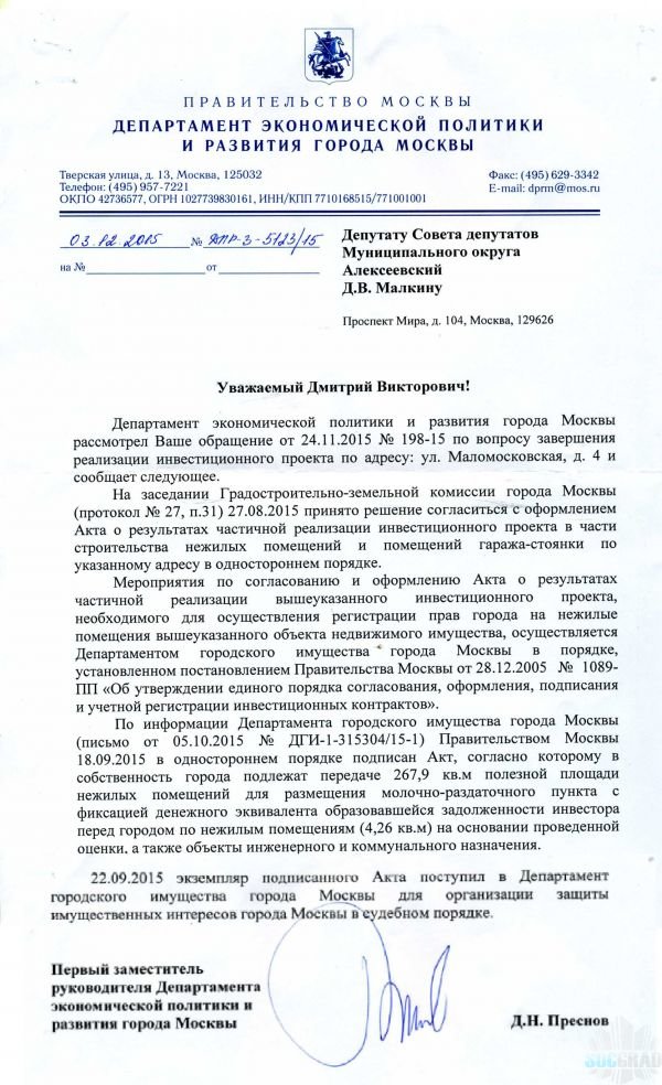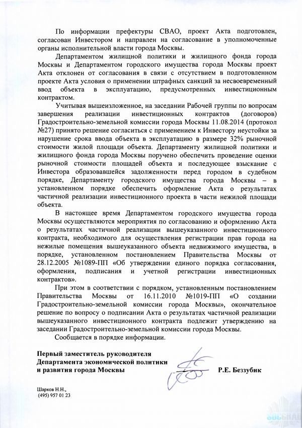 Сегодня получил ответ Департамента имущества Москвы. К сожалению, полученный ранее ответ префектуры СВАО не соответствует действительности. Ни о каком «оформлении права собственности» городом речи пока не идет. Инвестиционный контракт с застройщиков не закрыт, оформление права собственности не представляется возможным. Все переводят стрелки друг на друга.