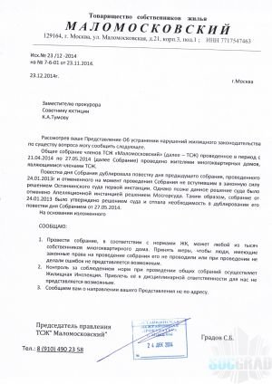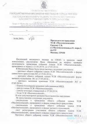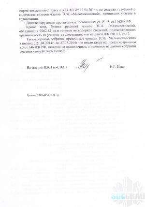 Проведя в период с 21.04.2014 по 27.05.2014 общее собрание Товарищества собственников жилья «МАЛОМОСКОВСКИЙ» (далее «ТСЖ»), состав которого составляет данный ЖК, жители по своей инициативе передали его материалы для утверждения данного решения в единственный орган уполномоченный проверять законность общих собраний — Инспекцию Жилищного Надзора по СВАО (далее «ИЖН»). Там им пообещали своевременно сообщить если потребуется прокомментировать любые детали или довезти что-то из документов. Однако через время окольными путями жители узнали о том, что ИЖН не признал данное собрание легитимным, сославшись на якобы обнаруженные нарушения допущенные членами ТСЖ при заполнении своих бюллетеней.