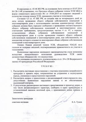 В прокуратуре не долго думая обвинили организаторов собрания виновными в том, что собрание признано несостоявшимся. Потребовали найти и наказать виновных, а о результатах доложить. При этом рождают просто фантастические по своей безграмотности документы. Попытки представителей Товарищества вразумить помощницу прокурора Чеховскую Яну Андреевну, выступающую организатором фронта борьбы с ТСЖ «МАЛОМОСКОВСКИЙ» и указать ей на безграмотность и топорность предпринимаемых ею мер приводят к новым репрессиям. Вместо того, чтобы разбираться по существу, дама решила всех мочить. Теперь из ее уст звучат угрозы применения административного взыскания к организаторам данного собрания. Свое рабочее время помощник прокурора Елена Андреевна Чеховская тратит на поиск виноватых во всех грехах в стане представителей Товарищества. Ресурсы прокуратуры брошены не на поиск правды и наказания действительно виноватых, а на подавление недовольных. Преследуемая прокуратурой цель ясна — чтобы никому не было повадным жаловаться на органы власти, надо замочить недовольных. Для этого средств у людей в избытке.