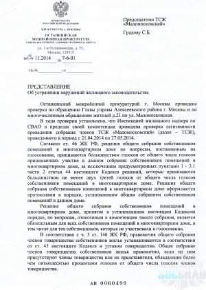 В поисках справедливости жители обратились в свою межрайонную Останкинскую прокуратуру с просьбой разобраться в обстоятельствах признания ИЖН общего собрания ТСЖ несостоявшимся. И вот тут начинается просто невероятно возмутительные события.
