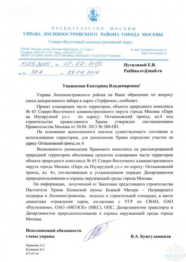На территории парка " Торфянка " напротив д.4 по Осташковскому пр. запланировано незаконное строительство храмового комплекса.