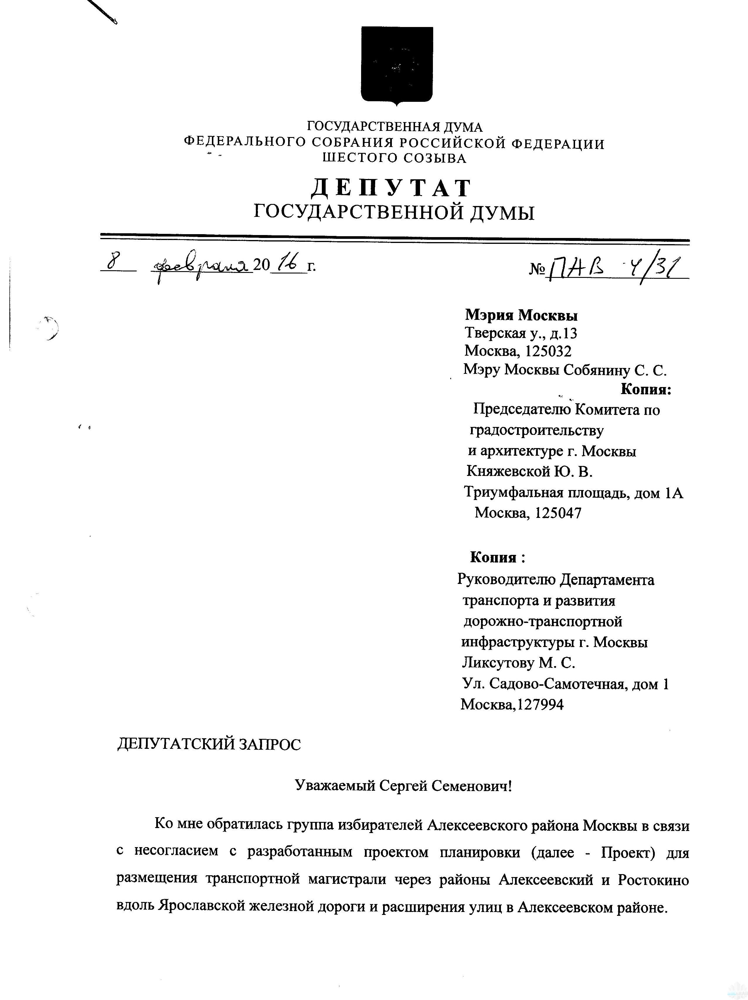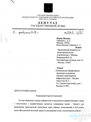 Копия запроса Депутата Госдумы Потапова А.В. по проекту реконструкции улично-дорожной сети Алексеевского района»
