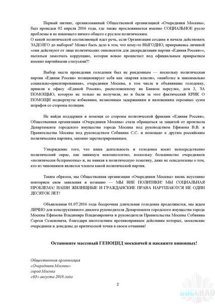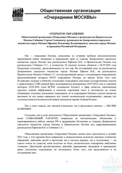 Накануне, 03 августа 2016 года сайте vk.com/ocheredniki голодающие выложили ОТКРЫТОЕ ОБРАЩЕНИЕ Общественной организации «Очередники Москвы» к руководителю Правительства Москвы Собянину Сергею Семеновичу, руководителю Департамента городского имущества города Москвы Ефимову Владимиру Владимировичу, жителям города Москвы и гражданам Российской Федерации, что их проблема СОЦИЛЬНАЯ и усугубляется системными нарушениями законов и бездействиями чиновников ДГИ.