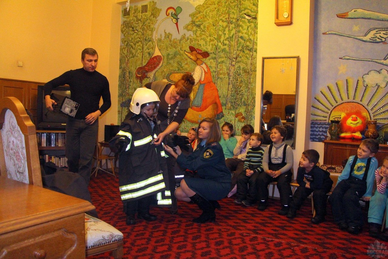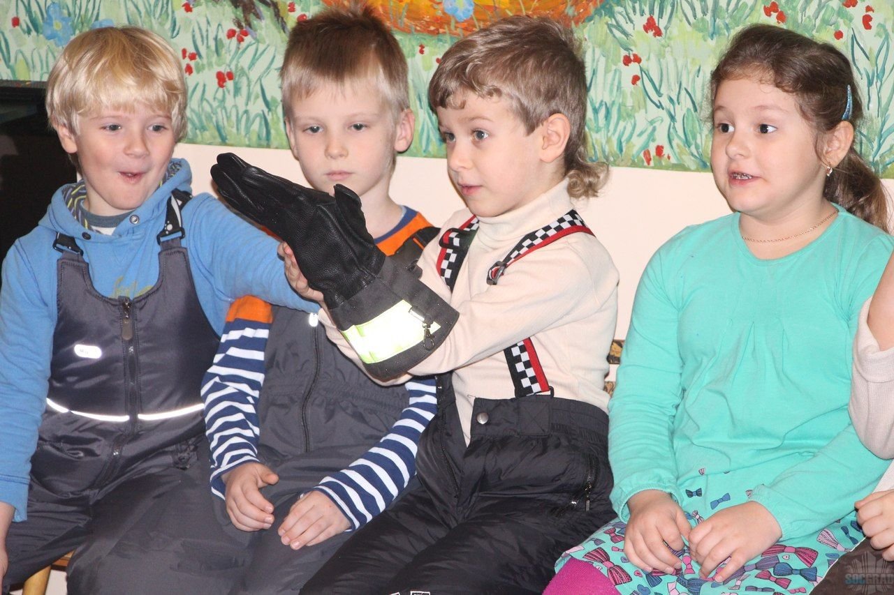 В игровой форме инспектор провела занятия на противопожарную тематику. В начале беседы инспектор рассказала о интересной, мужественной и очень сложной профессии пожарного. Татьяна Владимировна захватила с собой форму пожарного, чтобы наглядно показать и рассказать им, в какой форме пожарные спасают людей. Ребята окружили инспектора и с удовольствием начали примерять форму пожарного: каску, перчатки, боёвку. Глаза детей просто горели от любопытства: «А сколько весит форма пожарного?», «За какое время должны приехать пожарные?», «А до какого этажа достает лестница пожарной машины?»…