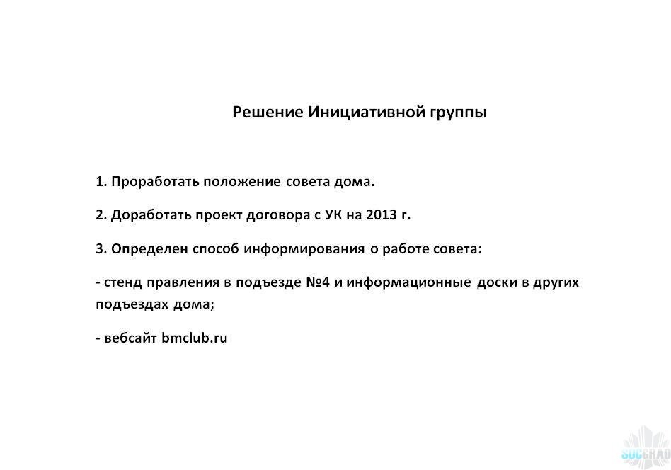 3. До 4.11.2012 решить вопросы по подготовке Общего собрания собственников Б.М. 4к2