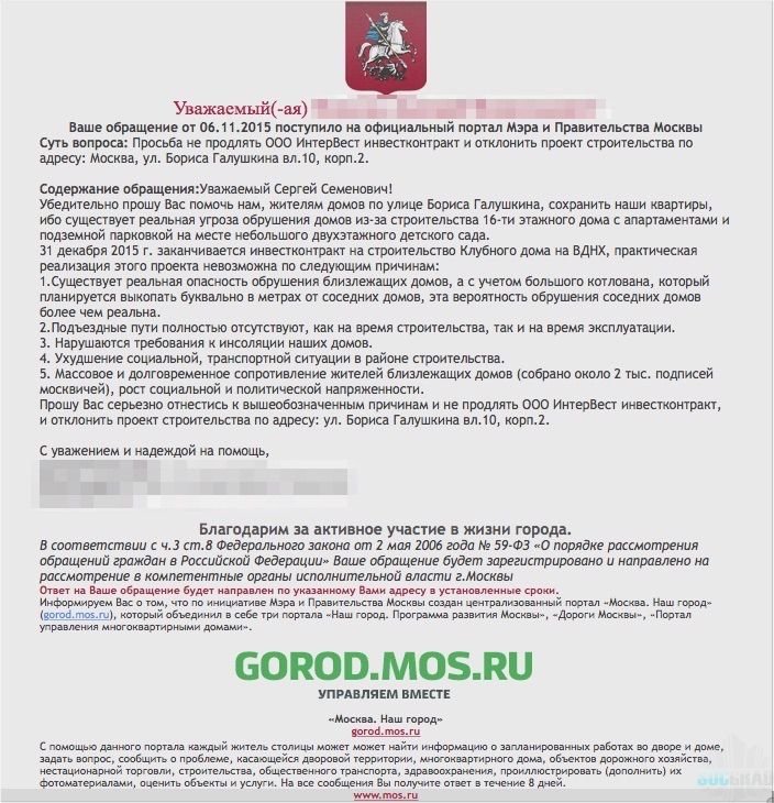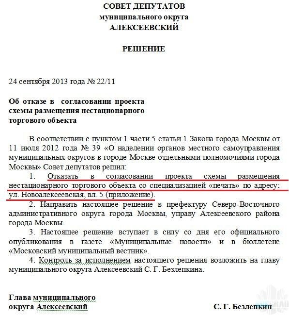 Резолюция была направлена в Мэрию Москвы, Префектуру СВАО, Управу и Муниципалитет Алексеевского района, УВД СВАО и Прокуратуру.