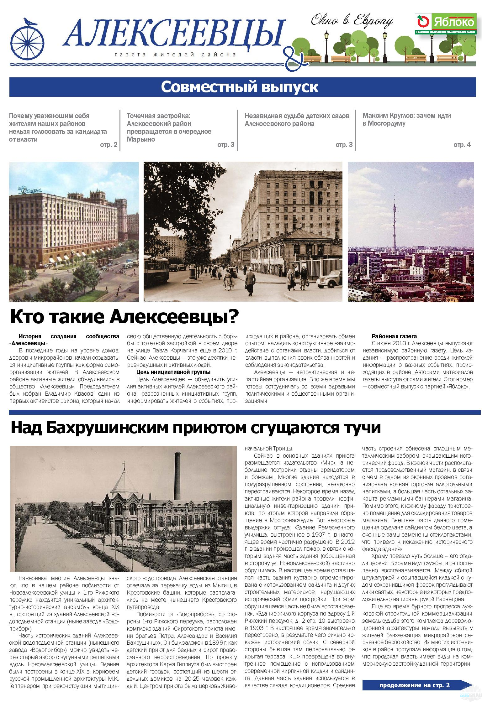 Цель издания – распространение информации среди жителей о важных событиях, происходящих в районе. Основной темой первого номера стало покушение на районного активиста и градозащитника Владимира Квасова, которое произошло 30 мая 2013 г. Также в материалах газеты описываются различные районные проблемы: продолжающаяся точечная застройка, ущемляющая интересы жителей района и при этом не всегда законная, нарушения в проведении публичных слушаний, рассказывается про неудачные проекты властей по строительству транспорно-пересадочных узлов у метро Алексеевская и ВДНХ, статья-расследования про то, как Муниципалитет проводит спортивно-досуговые мероприятия в районе, также мы рассказываем про среднесрочные планы строительсва новых жилых домов и офисов на территории района.Газета была подготовлена, напечатана и распространена среди жителей района на личные деньги активистов. Авторами материалов газеты выступили сами жители. Охват только печатной версии составил 10 тыс. квартир.