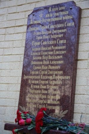 В память о жизни и деятельности ветеранов войны — Героев Советского Союза, проживавших в этом доме, было принято решение установить на фасаде здания мемориальную доску с указанием фамилий всех Героев.