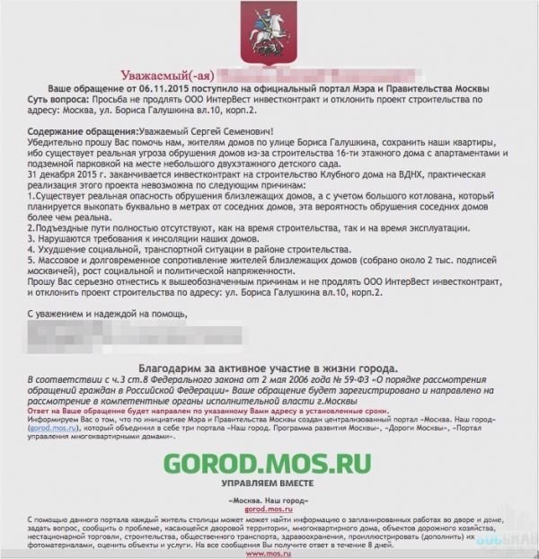 1. Провести проверку законности и прекратить строительство апарт-отеля на месте бывшего детского сада по адресу: ул. Бориса Галушкина д.10 стр.2.