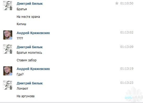 Расшифровка: я не местный, узнал из вконтактика от «православных активистов», что «наших бьют», прибежал помогать. Так как я православный активист, мне не надо включать голову и пытаться понять, почему всё так плохо, мне достаточно считать всех вокруг одержимыми бесами пьяными дегенератами. У меня нет оснований полагать, что компания «местных» «православных» может лгать на голубом глазу, поскольку раз они православные, значит белые и пушистые братья во Христе, в доску честные и за спасение душ окружающих радеют. Мне по барабану на вас, ваш сквер, у нас своя тусовка. Можете подавиться, церковь мы поставим несмотря на все ваши возмущения.