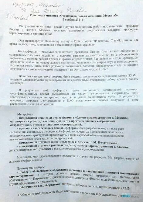 Согласно резолюции митинга, врачи и активисты требуют остановить «псевдореформу» московской системы здравоохранения с мораторием минимум на год, прекратить закрывать медицинские учреждения и сокращать сотрудников; предать гласности все подробности реформы, в том числе имена разработчиков и условия соглашений; уволить заместителя мэра по вопросам социального развития Леонида Печатникова, а также всех сотрудников департамента здравоохранения, имеющих отношение к проблеме.