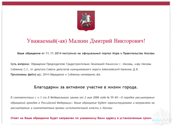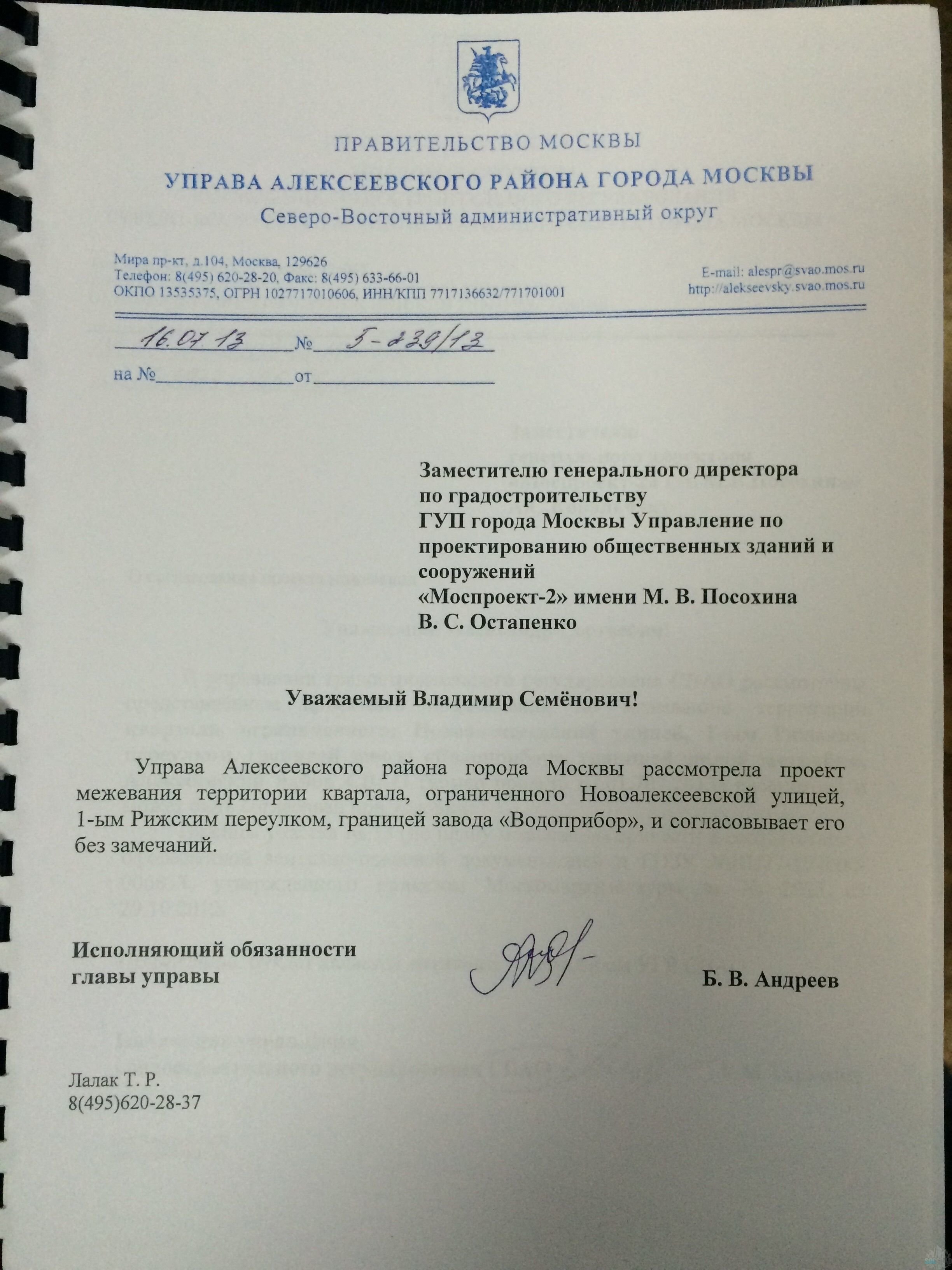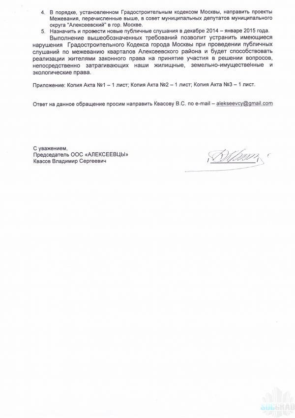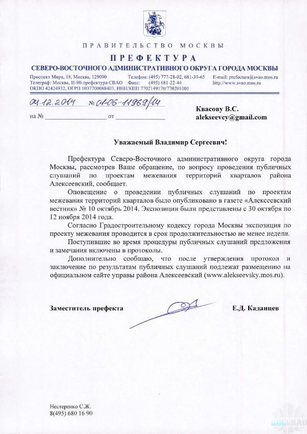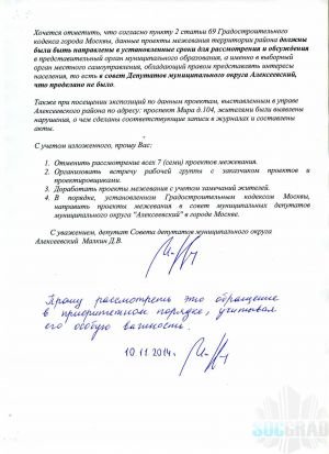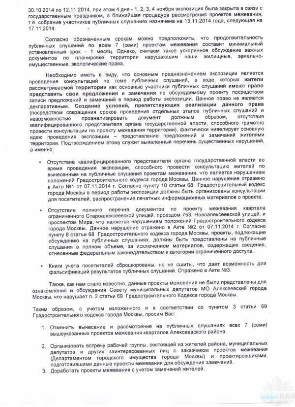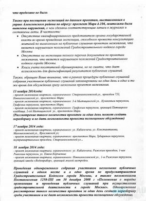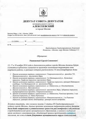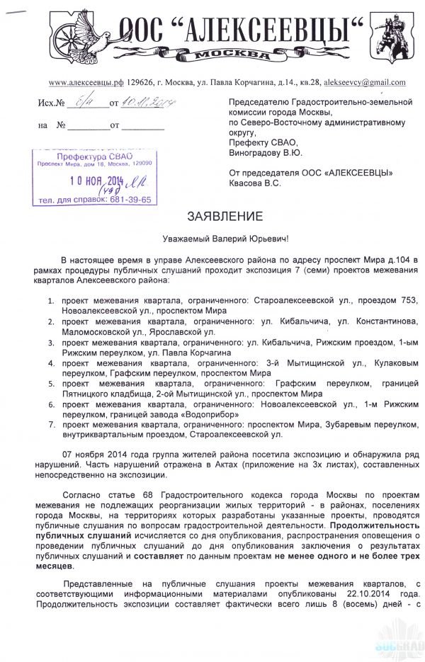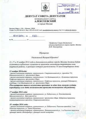 Сегодня (10.11.2014г.) нами было передано обращение Председателю Градостроительно-земельной комиссии города Москвы по СВАО, Префекту СВАО Виноградову В.Ю. с замечаниями по процедуре проведения публичных слушаний и требованиями: