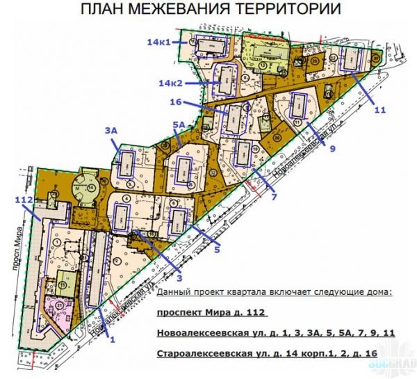 - Дому 112 по проспекту Мира выделяется земельный участок «меньше нормативно необходимого размера территории», при этом скверик у выхода из метро Алексеевская относится к категории «общего пользования».