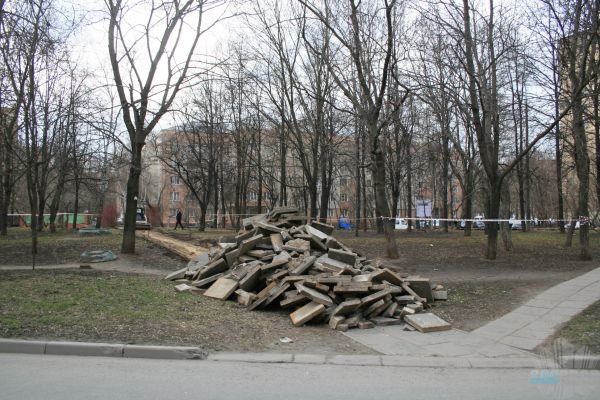Старт благоустройства сквера дан. 18 апреля торжественно начали выламывать тротуарную плитку.