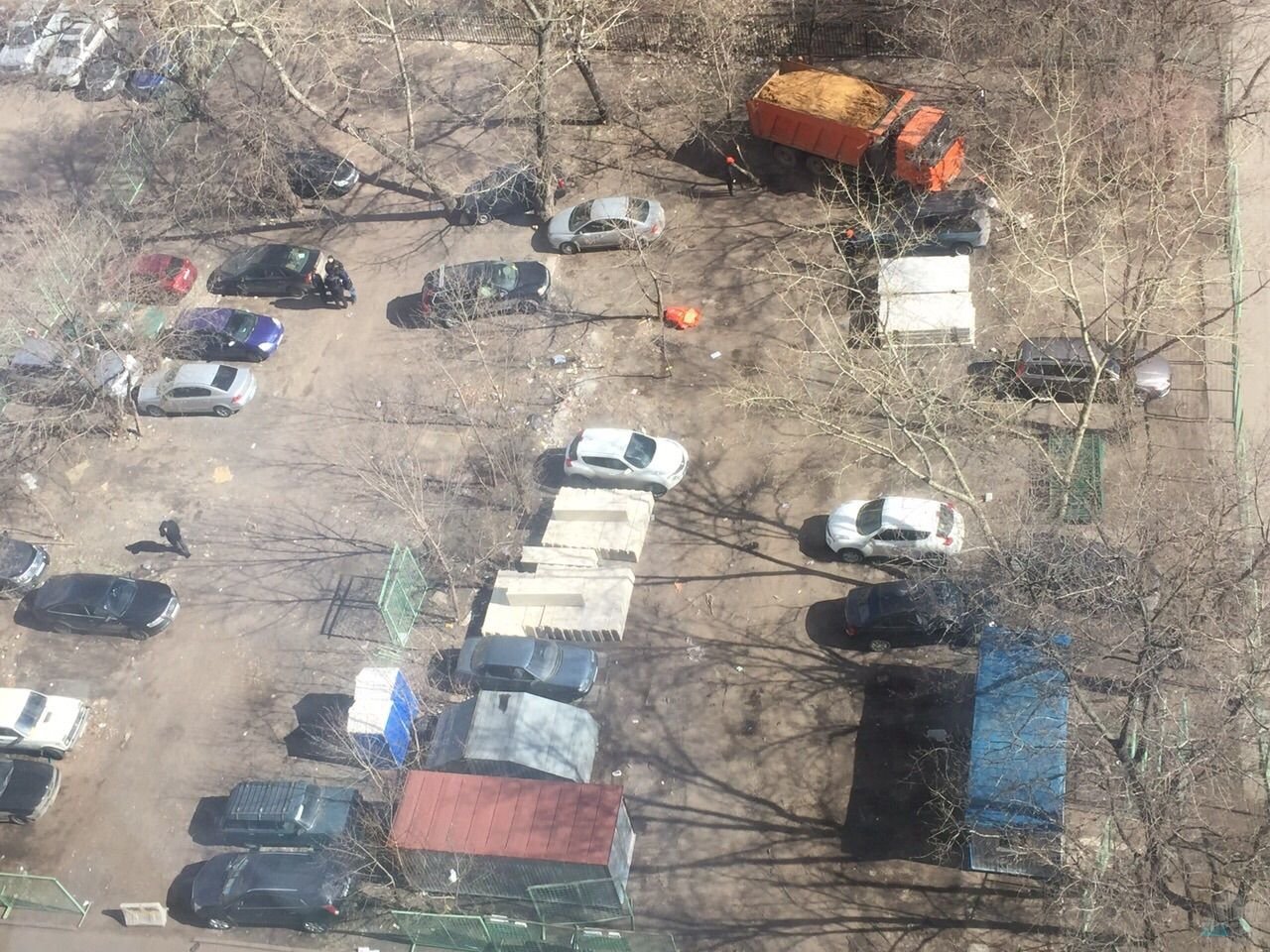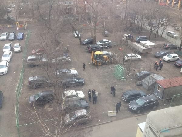 Во дворе дома 184 корп. 2 (знаменитый 25-этажный дом на ножках напротив монумента «Рабочий и колхозница») 9 апреля с утра огородили площадку прямо вместе с припаркованными на ней машинами. Устанавили бытовки. Таким образом на этом месте началась стройка объекта «медицинский центр» компанией ООО «М.К. Эсквайр».