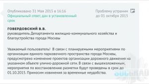 Также в ответ на обращения через портал Наш город по поводу стерной разметки на районных улицах Алексеевского района стали поступать ответы, что «в связи с планируемыми мероприятиями по организации единого парковочного пространства города Москвы, предусмотрено изменение проектов организации дорожного движения на указанном объекте улично-дорожной сети мероприятия по восстановлению разметки будут проведены в срок до 01.10.2015»