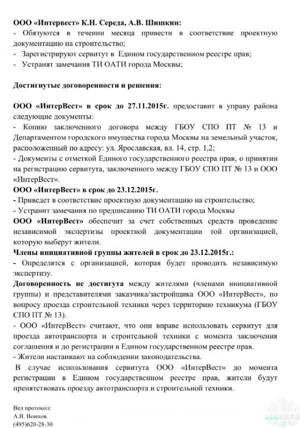 Главной целью созванного Управой заседания являлось выявление правовой основы действий застройщика и определение соответствия его документов тем, что были утверждены Москомстройнадзором. В результате выяснилось, что регистрация соглашения между директором колледжа Селенковым Н.Б. и ООО «ИнтерВест» отсутствует, таким образом, проезд по территории колледжа в настоящее время незаконен. Документация, согласно которой застройщик собирается строить и которую он приложил для получения ордера ОАТИ, не соответствует той, на которую было получено разрешение на строительство.