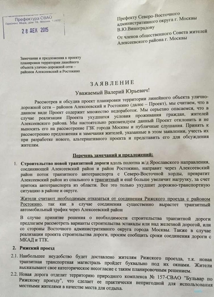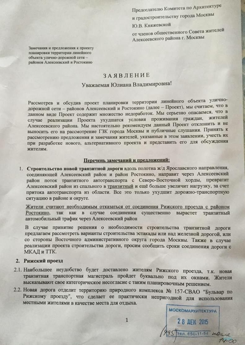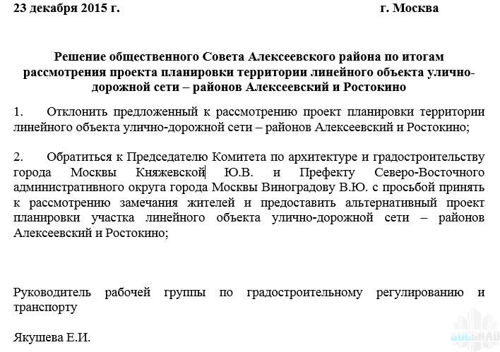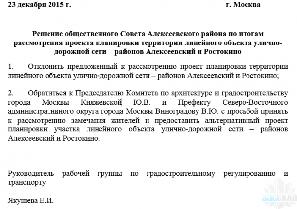 23 декабря 2015 г. жители района собрались для детального обсуждения проекта в рамках работы недавно созданного Общественного совета нашего района. Результатом общественного обсуждения стало решение Совета отклонить предложенный проект и обратиться к Префекту СВАО Виноградову В.Ю. и Руководителю Москомархитектуры Княжевской Ю.В. с просьбой принять к рассмотрению замечания жителей и предоставить альтернативный проект планировки участка линейного объекта улично-дорожной сети – районов Алексеевский и Ростокино.