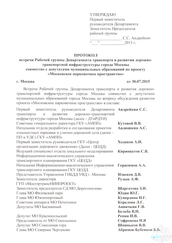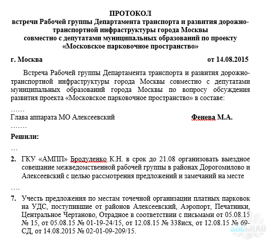 На первой встрече рабочей группы по обсуждению вопросов транспорта, общественного Совета Алексеевского района, прошедшей в середине октября, мы хотели узнать от представителя ГКУ «АМПП» Ксении Бродуленко, кто же из муниципальных депутатов нашего района участвовал в заседаниях рабочей группы при Департаменте транспорта по развитию парковочного пространства. Кто представлял и должен был защищать интересы жителей Алексеевского района в межведомственных комиссиях, а вместо этого дал в Департамент транспорта и АМПП предложения о включении ряда улиц в зону платной парковки, предав тем самым общественные интересы?
