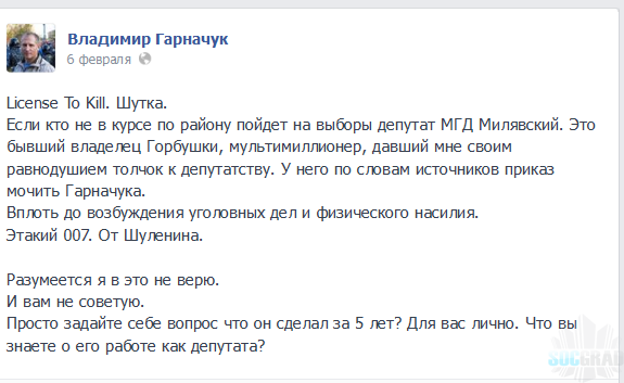 «Милявский и его команда доставили мне несколько незабываемых минут в объятьях удушающего приема его охраны, и при этом шептавших мне „давай дружище вали отсюда“, — пишет Гарначук.