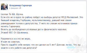 Ранее Гарначук заявлял, что Милявскому „поручено любыми методами нейтрализовать