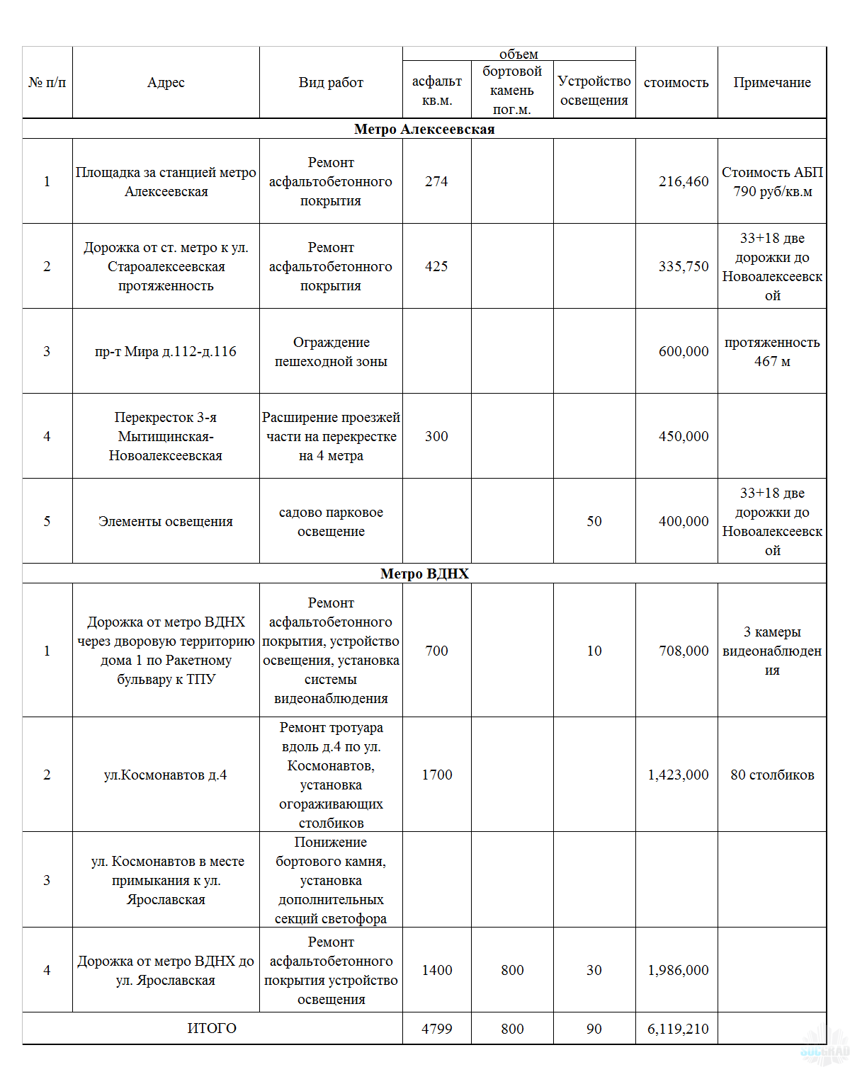 Адресный перечень работ, выполняемых в рамках реализации программы повышения повышения пешеходной доступности станций метро Алексеевская, ВДНХ