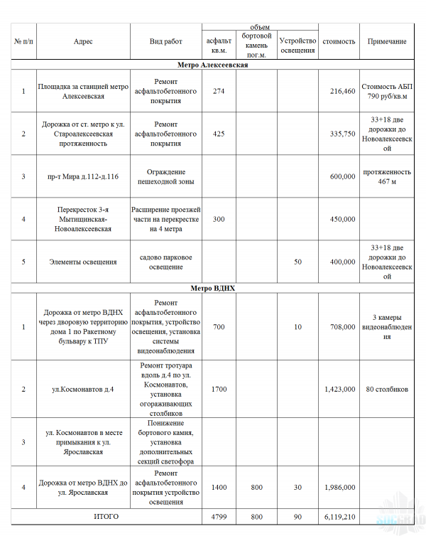 Управа района уже подготовила «Адресный перечень работ, выполняемых в рамках реализации программы повышения повышения пешеходной доступности станций метро Алексеевская, ВДНХ», который предполагается провести в этом году. Общая стоимость работ около 6 млн рублей.