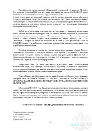 Накануне, 03 августа 2016 года сайте vk.com/ocheredniki голодающие выложили ОТКРЫТОЕ ОБРАЩЕНИЕ Общественной организации «Очередники Москвы» к руководителю Правительства Москвы Собянину Сергею Семеновичу, руководителю Департамента городского имущества города Москвы Ефимову Владимиру Владимировичу, жителям города Москвы и гражданам Российской Федерации, что их проблема СОЦИЛЬНАЯ и усугубляется системными нарушениями законов и бездействиями чиновников ДГИ.