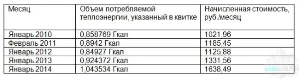 В данном случае в квитках, которые я сам получаю как житель дома 25 на проезде Донелайтиса, четко прослеживается очень серьезный рост учтенного количества потребляемой теплоэнергии – более чем на 21,5% за четыре года, как показано в приведенной ниже таблице.