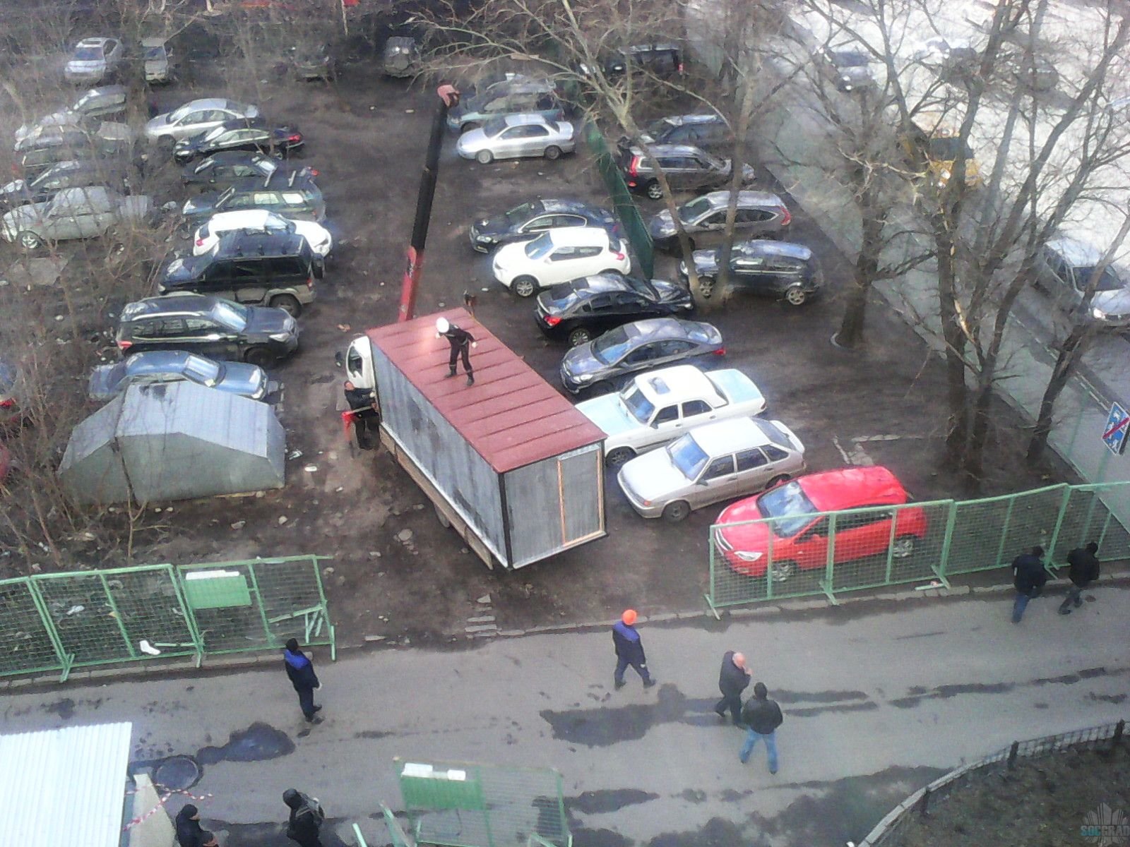 Во дворе дома 184 корп. 2 (знаменитый 25-этажный дом на ножках напротив монумента «Рабочий и колхозница») 9 апреля с утра огородили площадку прямо вместе с припаркованными на ней машинами. Устанавили бытовки. Таким образом на этом месте началась стройка объекта «медицинский центр» компанией ООО «М.К. Эсквайр».