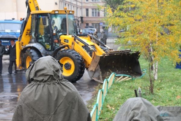 Стоявшие на автостоянке между домами автомобили жильцов были вывезены эвакуаторами на соседние улицы. Строительная техника ломала ограждения, строители устанавливали бетонные блоки и металлические заборы на площади в несколько сотен квадратных метров между домами. Попытки журналистов «ЯБЛОКА» пройти внутрь оцепленной территории, еще час назад бывшей двором, встретили сопротивление со стороны неких людей с нашивками ФСБР.
