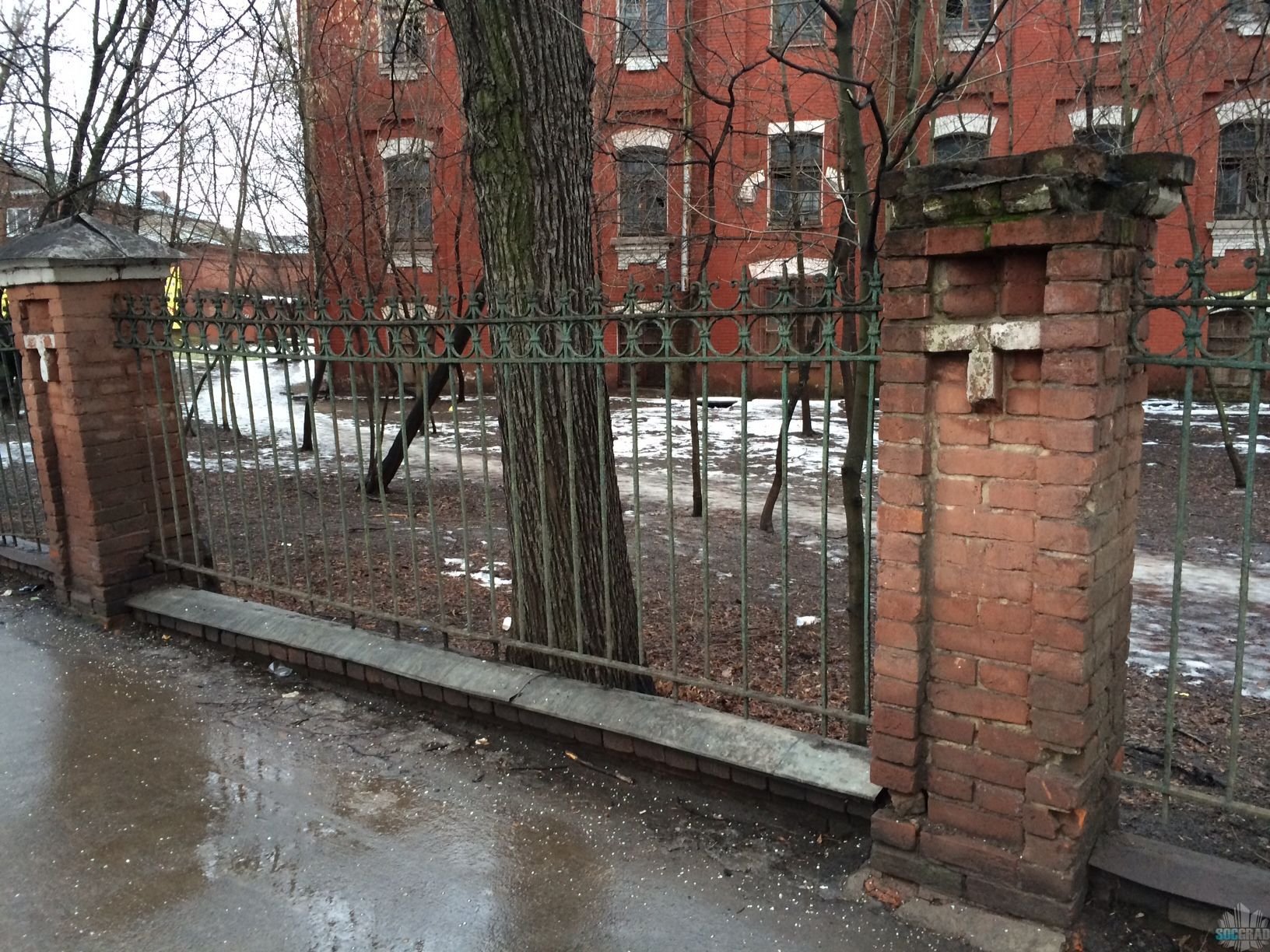 Небольшая справка. Как выяснилось, старая Алексеевская водокачка (потом завод Водоприбор) простиралась на противоположную от Водоприбора сторону улицы, точнее, там она находилась изначально, её более старая часть. Поэтому ограда и выстроена в едином стиле. При руконструкции в 1880-е годы, когда были выстроены дошедшие до нас постройки, ввиду расширения комплекса, обе его части были оформлены этой одинаковой оградой. Сейчас эту ограду по другую сторону от Водоприбора сохранять не хотят, т.к. расширение дороги «предусмотрено».