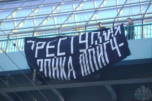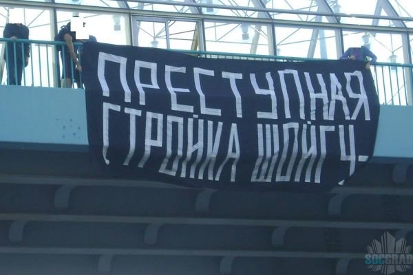 Вчера вечером (04.08.14) в Хамовниках на Андреевском мосту напротив строящегося здания Генштаба сухопутных войск неизвестными активистами был вывешен огромный баннер «Преступная стройка Шойгу».