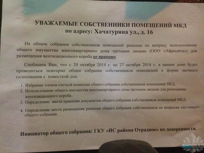 На фасад жилого дома, под окна квартир арендаторами подвала выведена вентиляция. Переписка с властями длится уже много лет. Но власти вместо того что демонтировать вентиляцию, решили попытаться ее узаконить. 14.10.14 на подъездах появилось объявление что в доме будет проводится заочное голосование в рамках общего собрания собственников. Такая форма оповещения нарушает статью 45 ЖК РФ, но управляющей компании на это наплевать